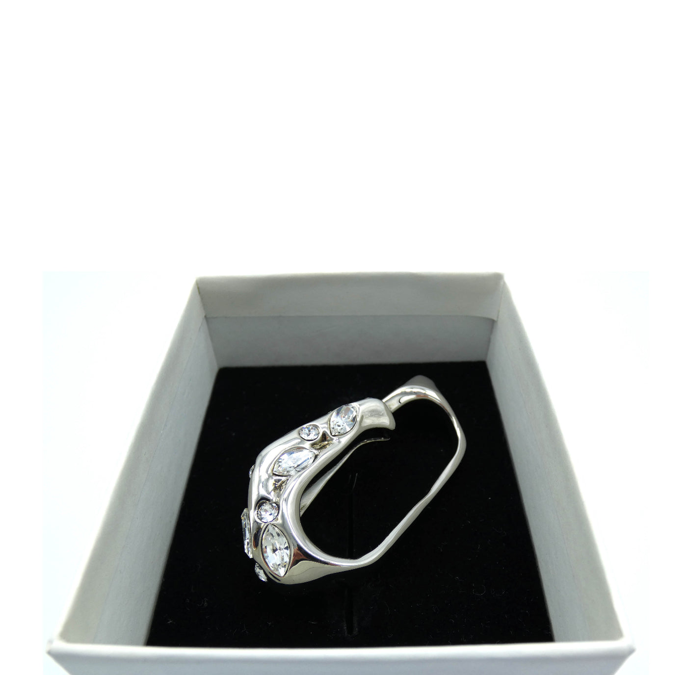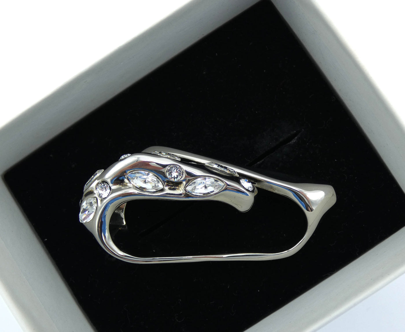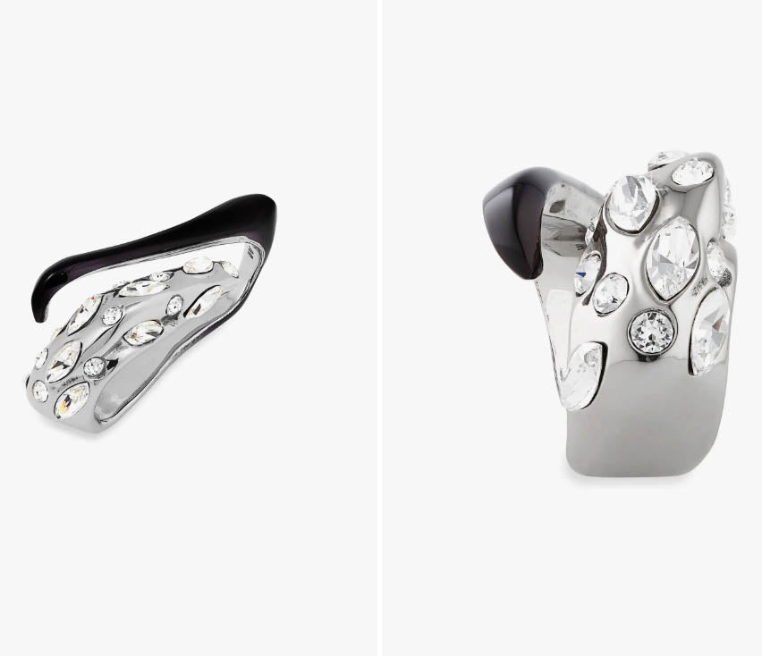 Another standout sculptural art piece from Alexander McQueen's jewelry line. This multi finger ring (typically the index, middle and ring finger) is designed to be worn like a hand ornament. making it a bold accessory rather then just a simple ring. This rings defining feature is its artistic quality, aligning with McQueen's broader design ethos, of blending fashion with dramatic visceral visual cues. Another blur by Alexander McQueen between fashion, jewelry and sculpture. Wear this with something simple or pair it with bold, edgy looks, to show off what great taste you have. From Alexander McQueen.