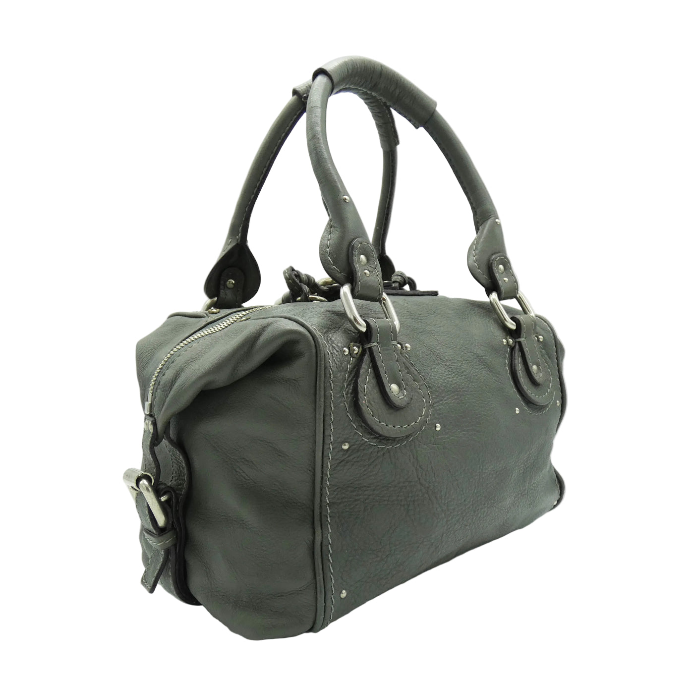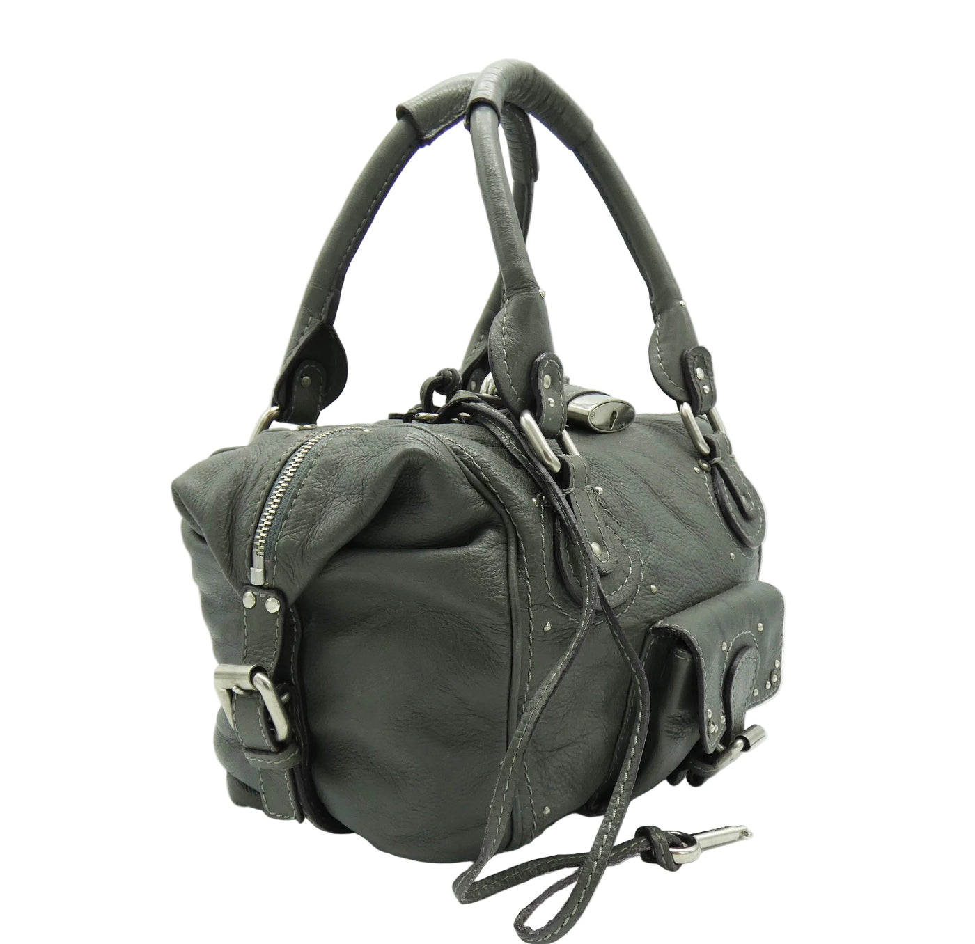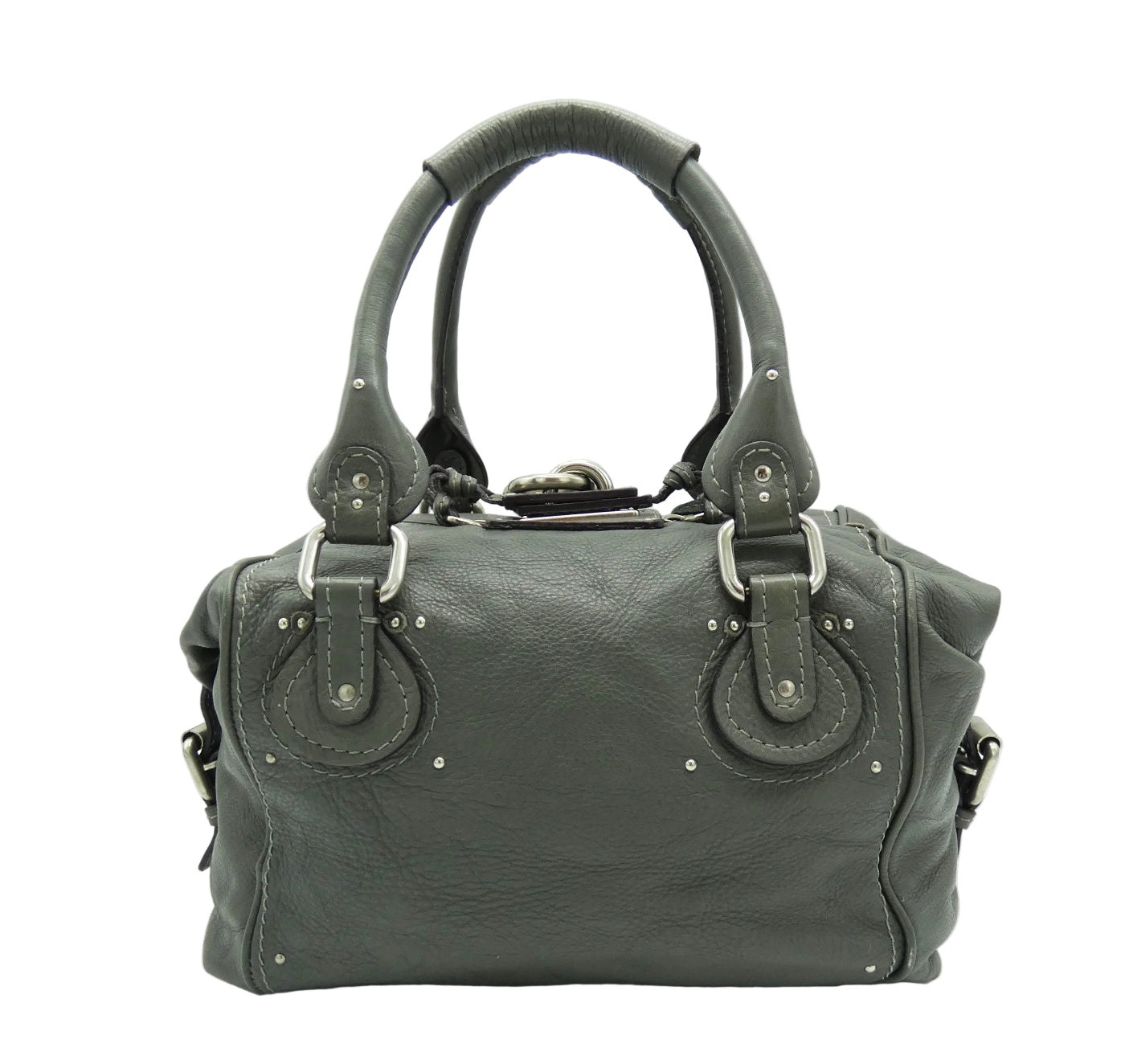 OA Fashion Feedback: This bag is an iconic piece of art by Chloe from Fall/Winter 2007, in great condition even with it's handle repair. Of the many different Paddington types, this one is large and versatile with a lovely spacious interior and multiple exterior pockets, on its boxier shape, with studded details all over. These iconic bags are made to last, are very sturdy and are great investments. The large Chloe lock and key is really chic in antique silver and grey, a super all season colour, and this bag is one of the largest of the classic Paddington's with its front flap pocket and side straps. Show off what great taste you have with this beautiful addition, from Chloe.