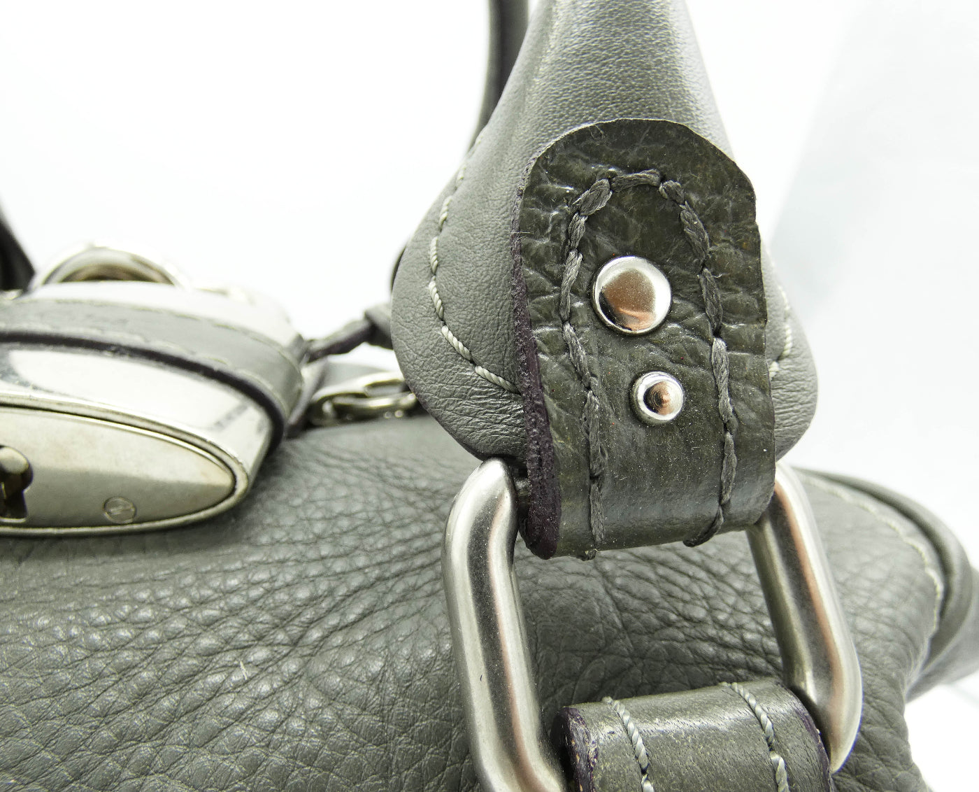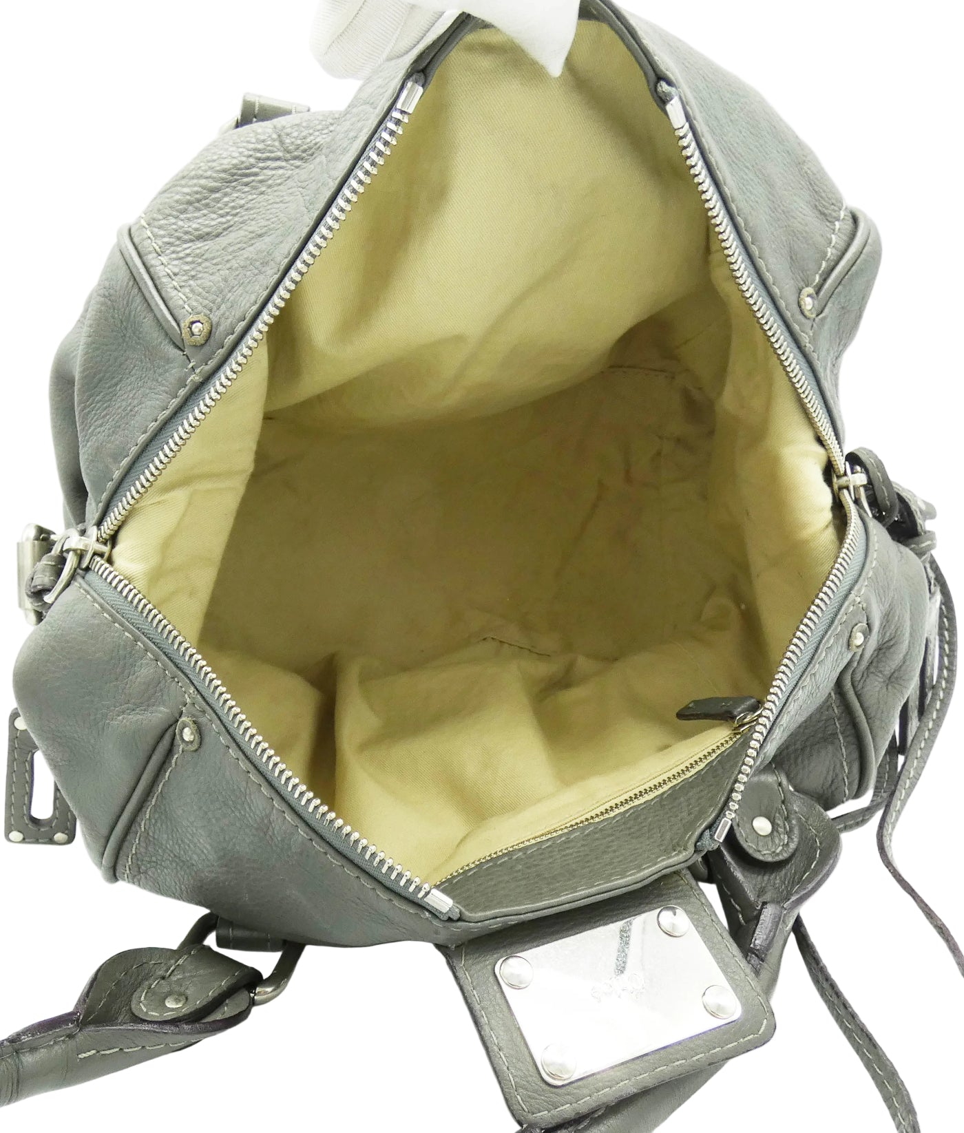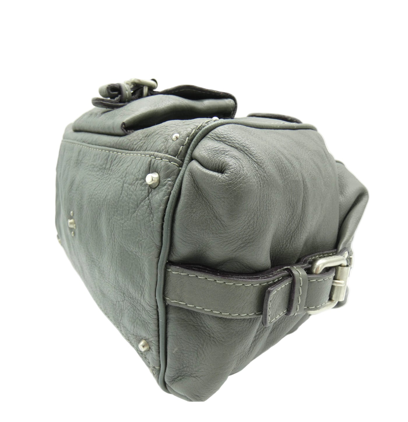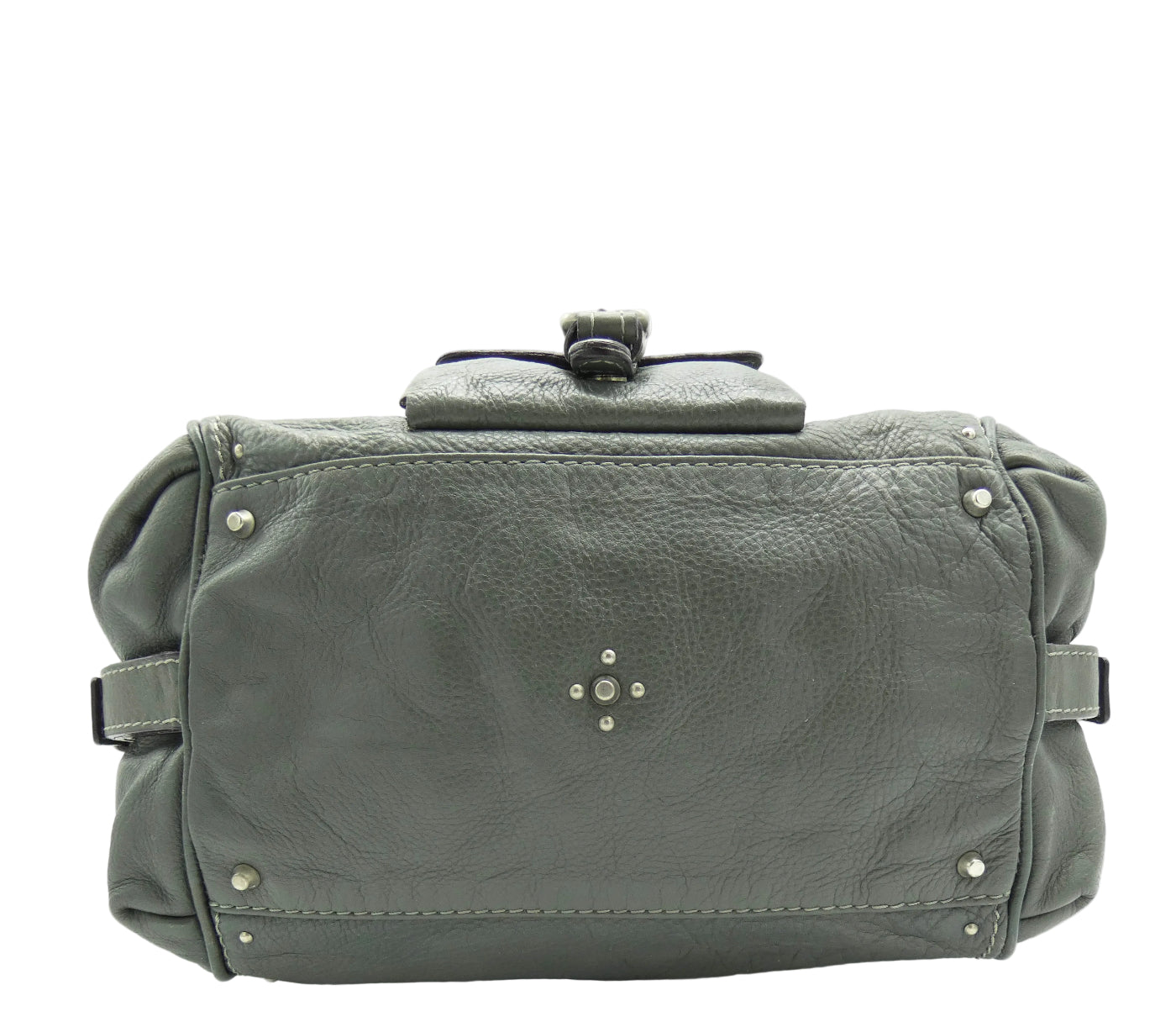 OA Fashion Feedback: This bag is an iconic piece of art by Chloe from Fall/Winter 2007, in great condition even with it's handle repair. Of the many different Paddington types, this one is large and versatile with a lovely spacious interior and multiple exterior pockets, on its boxier shape, with studded details all over. These iconic bags are made to last, are very sturdy and are great investments. The large Chloe lock and key is really chic in antique silver and grey, a super all season colour, and this bag is one of the largest of the classic Paddington's with its front flap pocket and side straps. Show off what great taste you have with this beautiful addition, from Chloe.