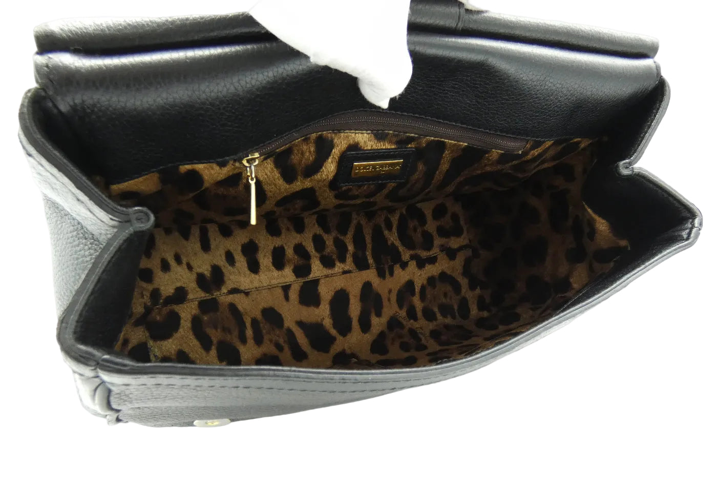 OA Fashion Feedback: Casual unstructured model black smooth leather Sicily from Fall/Winter 2011. This bag is complimented with gold tone hardware with top handle and detachable shoulder strap. The lining is in iconic Dolce & Gabbana leopard print. This larger style Sicily bag has plenty of room to use as an everyday bag, or for that special occasion. The front magnetic flap opens to an interior with 2 patch pockets, one large zipped pocket and a card slot. This iconic bag type is a must have, get it while it's still here, from Dolce & Gabbana.