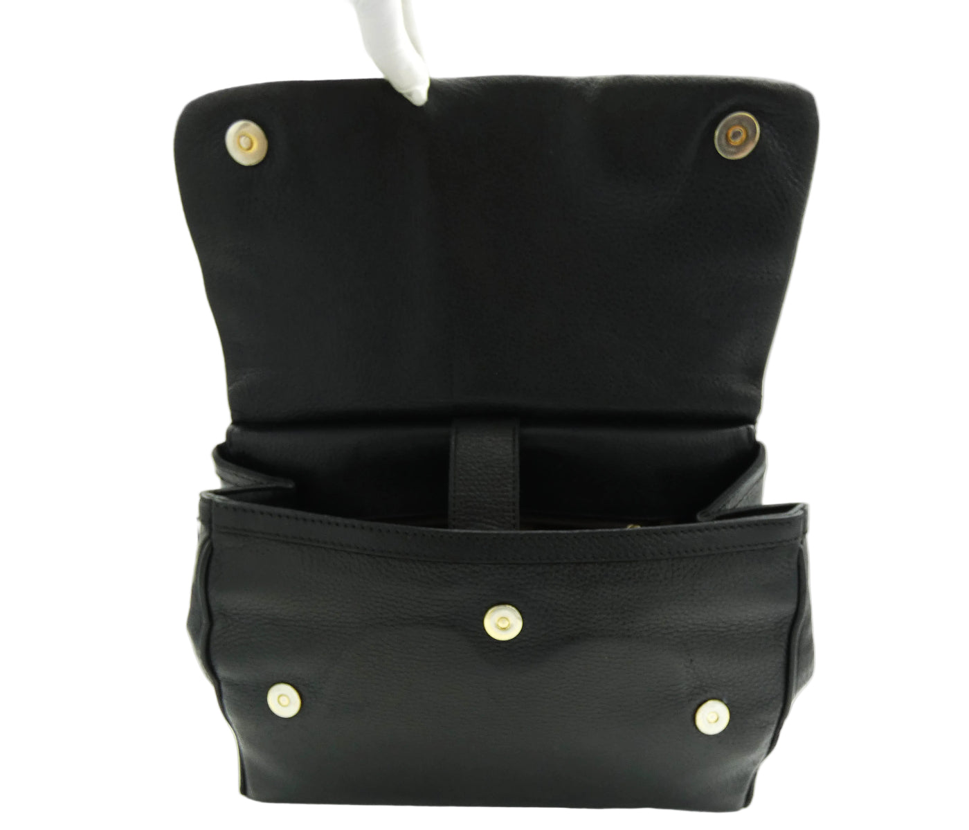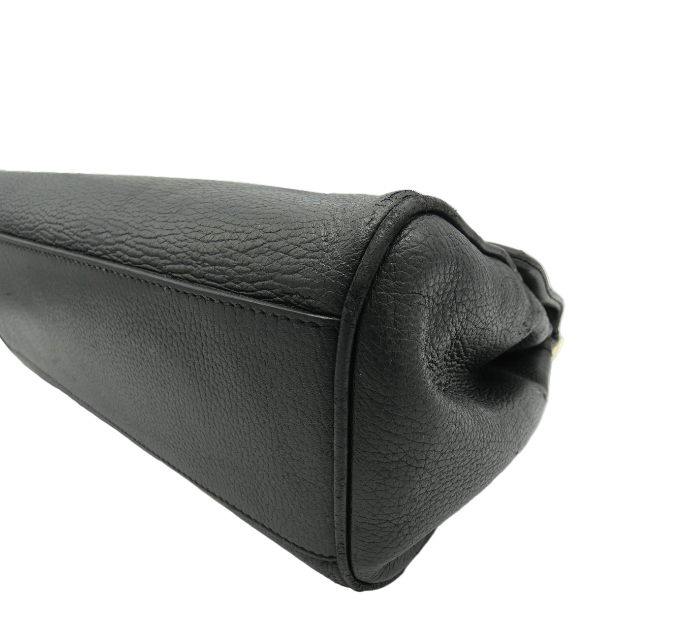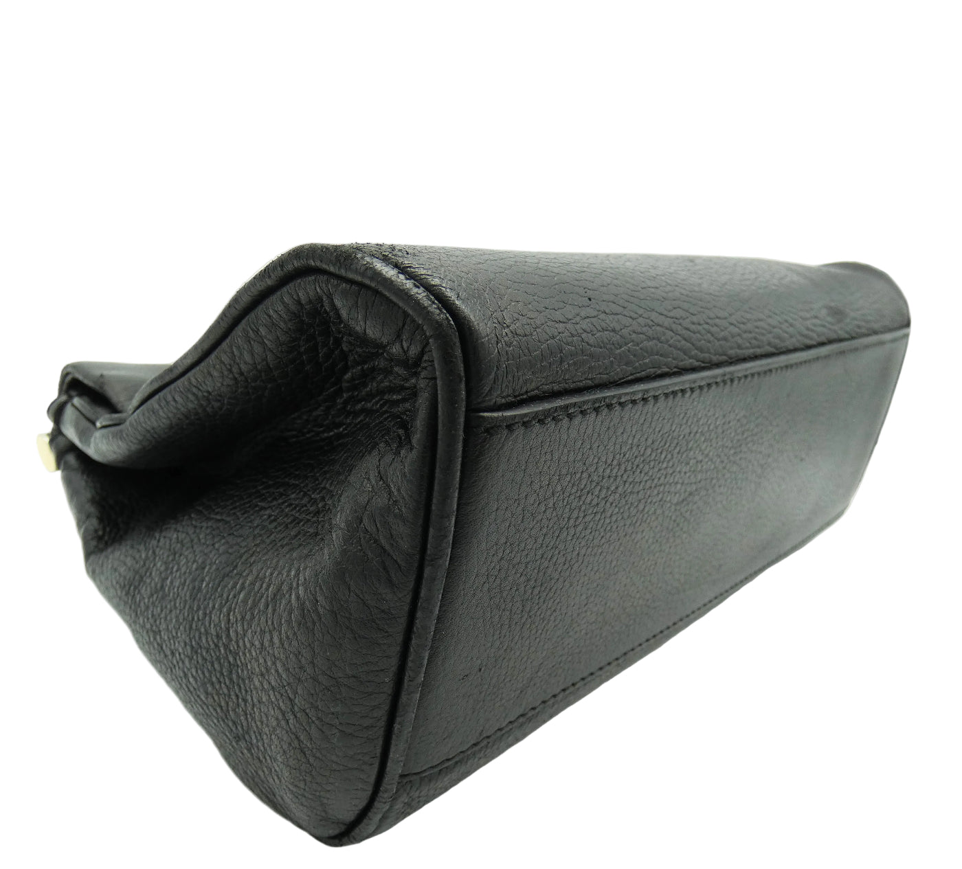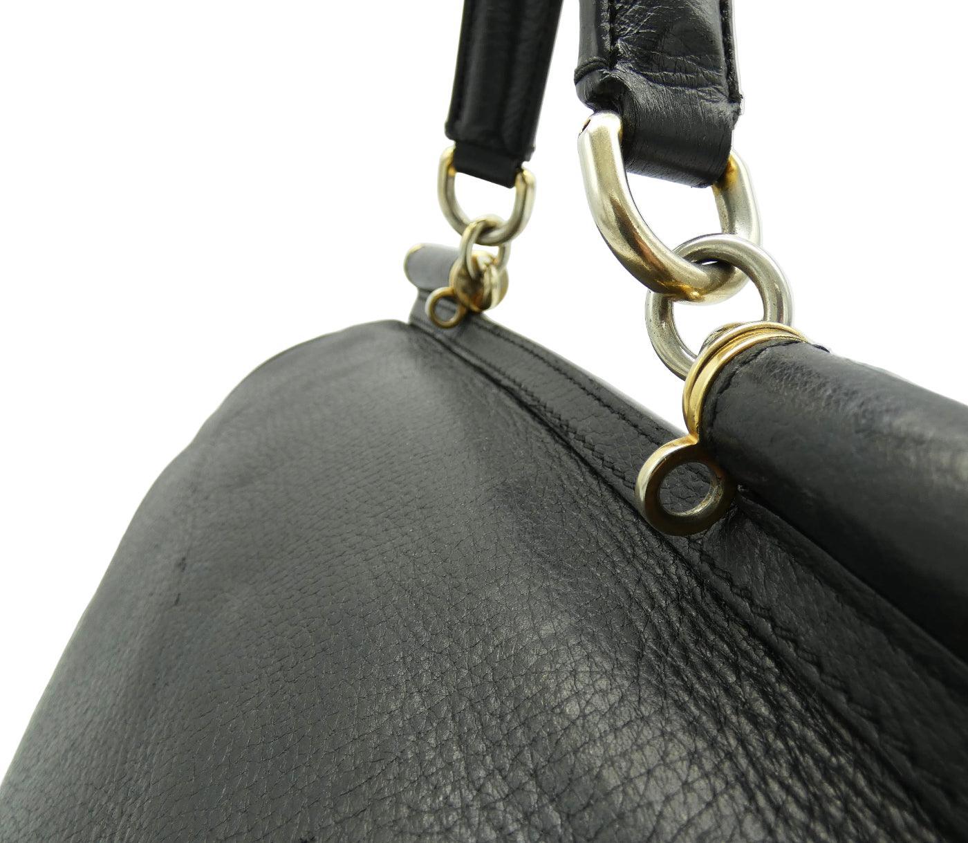 Detail: Overall Good Condition. Bag has lost some of its original structure from age and the leather has softened. Exterior leather shows wear and rubbing on the corners, with some additional wear in the form of scratches and indents in the leather throughout the exterior as pictured. The handle shows wear underneath, and hardware shows some fading and tiny hairline scratches. The fabric interior is in very good condition. All zips and snaps work well.